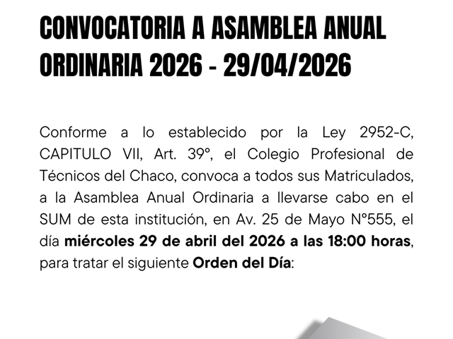 Se convoca a los Matriculados para la Asamblea Anual Ordinaria.